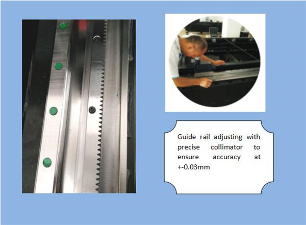 | Nama:Driver & motor servo AC Motor servo yang diimpor (sumbu Y yang digerakkan oleh dua motor servo) bersama dengan peredam planetary yang canggih memastikan drive yang mantap, presisi, dan andal. |